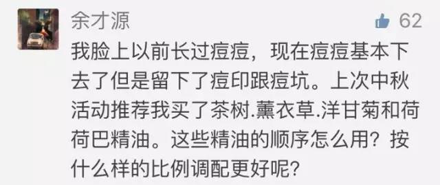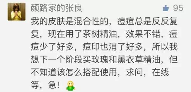 因為身體對功效型的護膚品、藥品等會產(chǎn)生“抗性”,長時間單一使用會讓效果變差。所以單一精油或同一精油配方建議三周更換1次配方或比例。建議日常除了直接用茶樹精油直接點涂痘痘救急外,平時可用1滴茶樹精油+2滴薰衣草精油+10ml荷荷巴精油混合稀釋調(diào)理痘痘?。看稳?滴左右避開眼周全臉使用)。